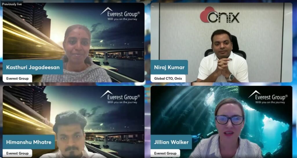 In a recent LinkedIn Live session hosted by Everest Group in collaboration with Onix, Niraj Kumar, CTO, Onix sat down with Jillian Walker, VP, Kasthuri Jagadeesan, Research Director and Himanshu Mhatre, Senior analyst at Everest Group to unpack a shift many enterprises are beginning to acknowledge quietly: AI is no longer confined to chatbots or single-task automation. It is starting to plan, coordinate, and act across systems in ways that resemble collaborative work rather than simple instruction-following.This steady move towards agent-driven systems, AI capable of completing multi-step tasks with limited supervision, shaped the conversation. Across the hour, the speakers explored what agentic AI looks like inside real organizations, where the early value is emerging, and what companies must get right to scale it responsibly. For those who’d like to dive deeper into the full discussion, you can watch the complete webinar here.