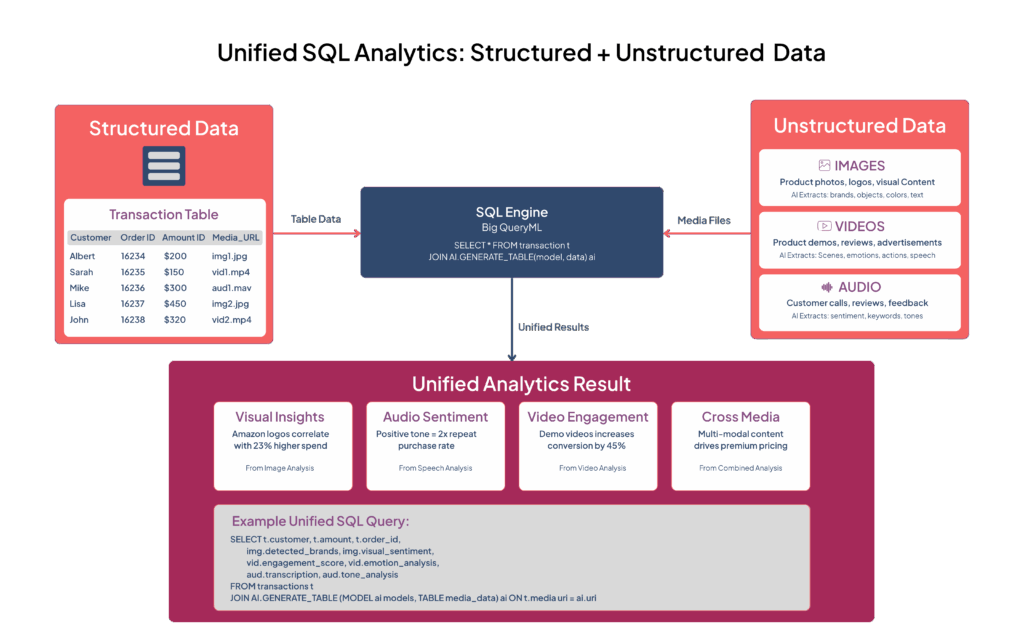 In essence, unified SQL analytics is the future as it brings together structured transaction tables with AI-generated insights from product images. With a single SQL query, companies can obtain valuable information like:
