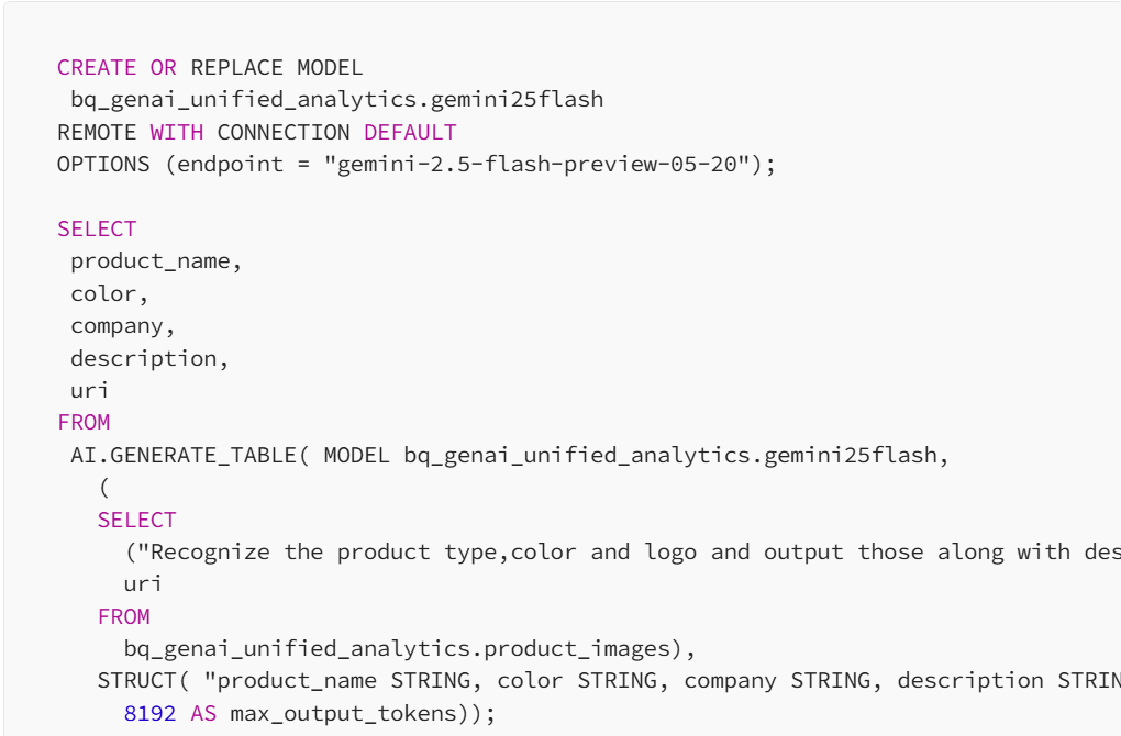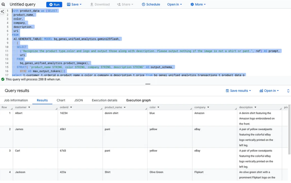 Effectively, this means unlocking actionable insights from product image files. Next, let’s consider a real-world use case of unified SQL analytics using Google BigQuery.