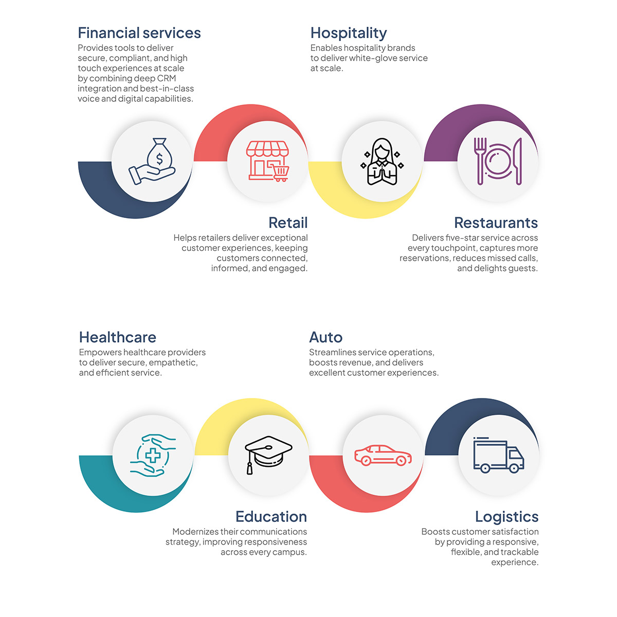 - Global contact center: Supports a distributed customer base across regions and time zones while maintaining security, compliance, and call quality.